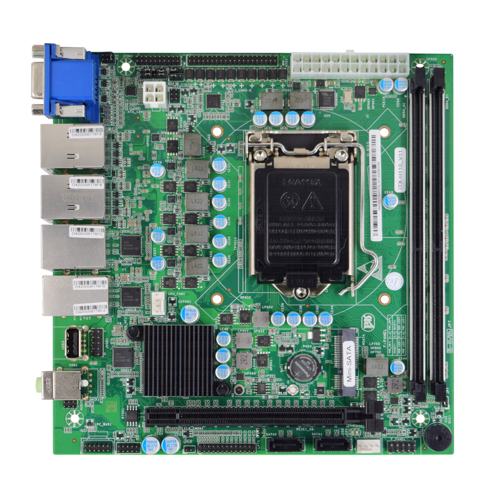 The ITX-H110_V11 is a rugged industrial-grade Mini-ITX motherboard based on the Intel® H110 chipset. Engineered for 24/7 operation in harsh environments, it offers extensive I/O connectivity, multiple serial ports, and robust expansion capabilities for machine vision, AI video analytics, and automation systems.