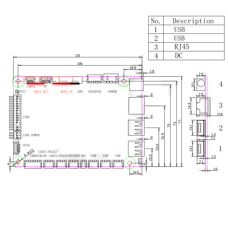 USB × 2 (on-board), PH2.0 4-pin × 3 (extended)